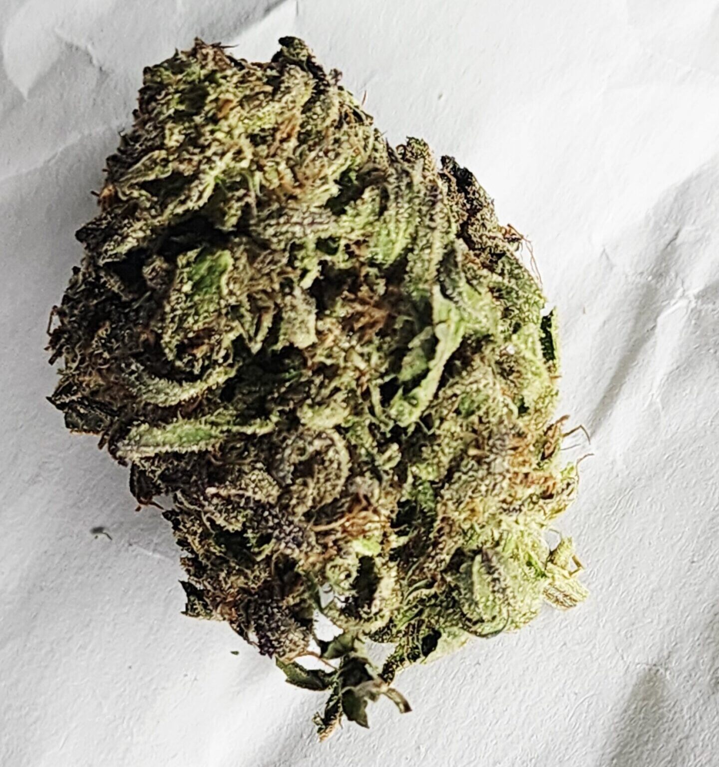 This bud has grape-shaped olive green nugs with thin amber hairs, deep purple undertones and tiny frosty white trichomes.