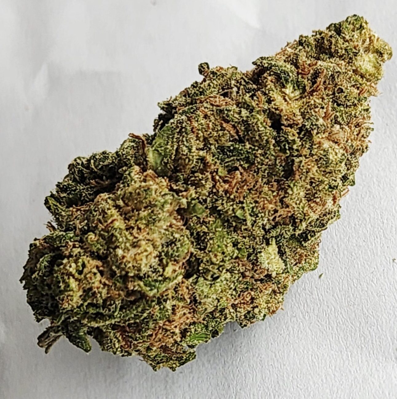 This bud has fluffy, heart-shaped minty green nugs with amber undertones, super thin orange hairs and a frosty coating of tiny, vibrantly white crystal trichomes.
