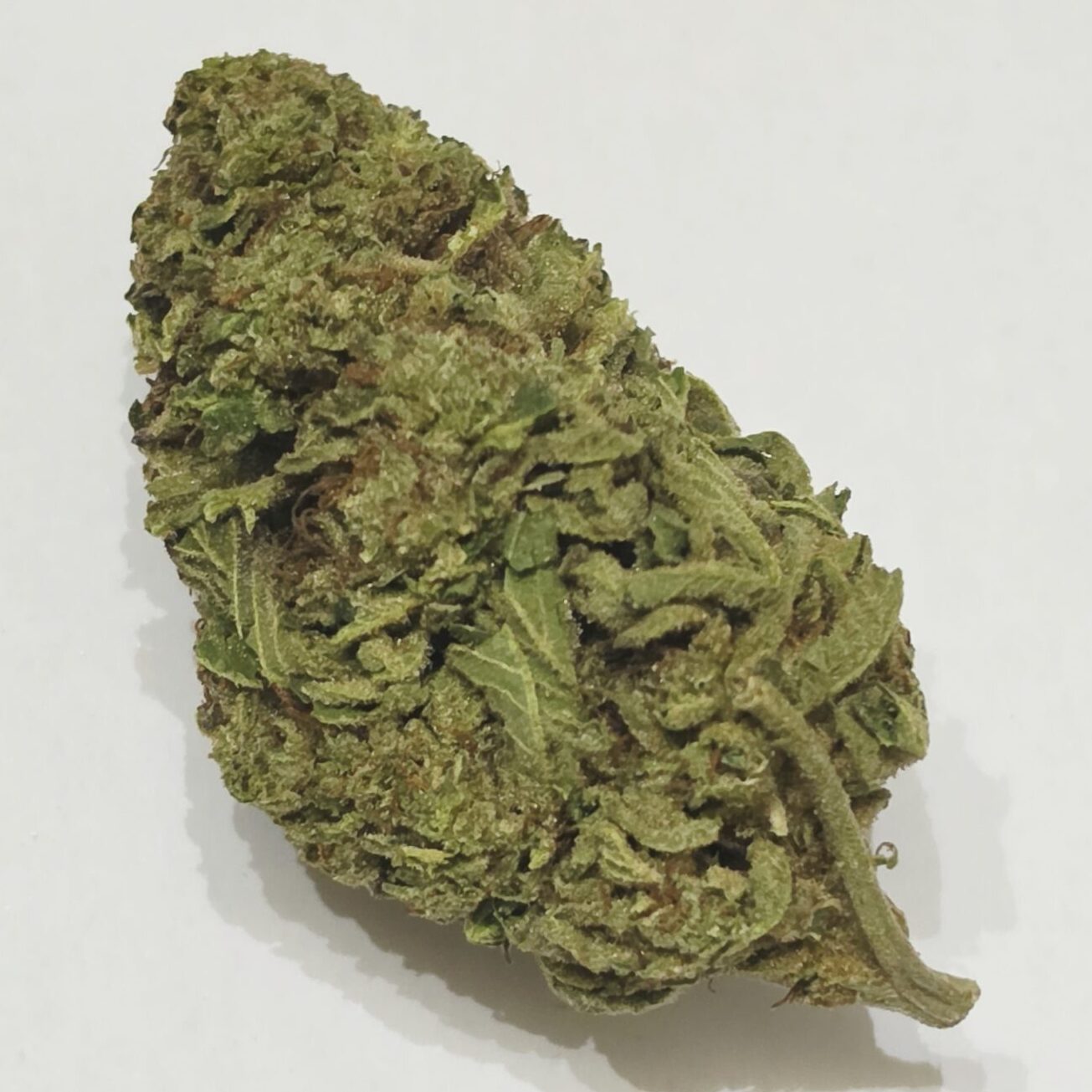 Pineapple MAC buds have fluffy and small, heart-shaped forest green nugs with golden undertones, thin orange hairs and frosty, chunky golden-amber crystal