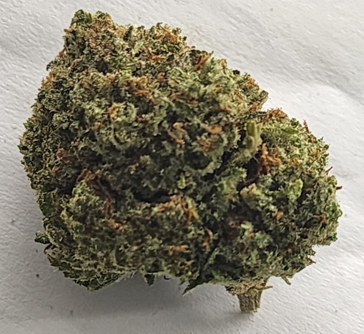 This bud has small and dense rounded forest green nugs with purple undertones, lots of thin orange hairs and a coating of tiny, purple-tinted white crystal trichomes.